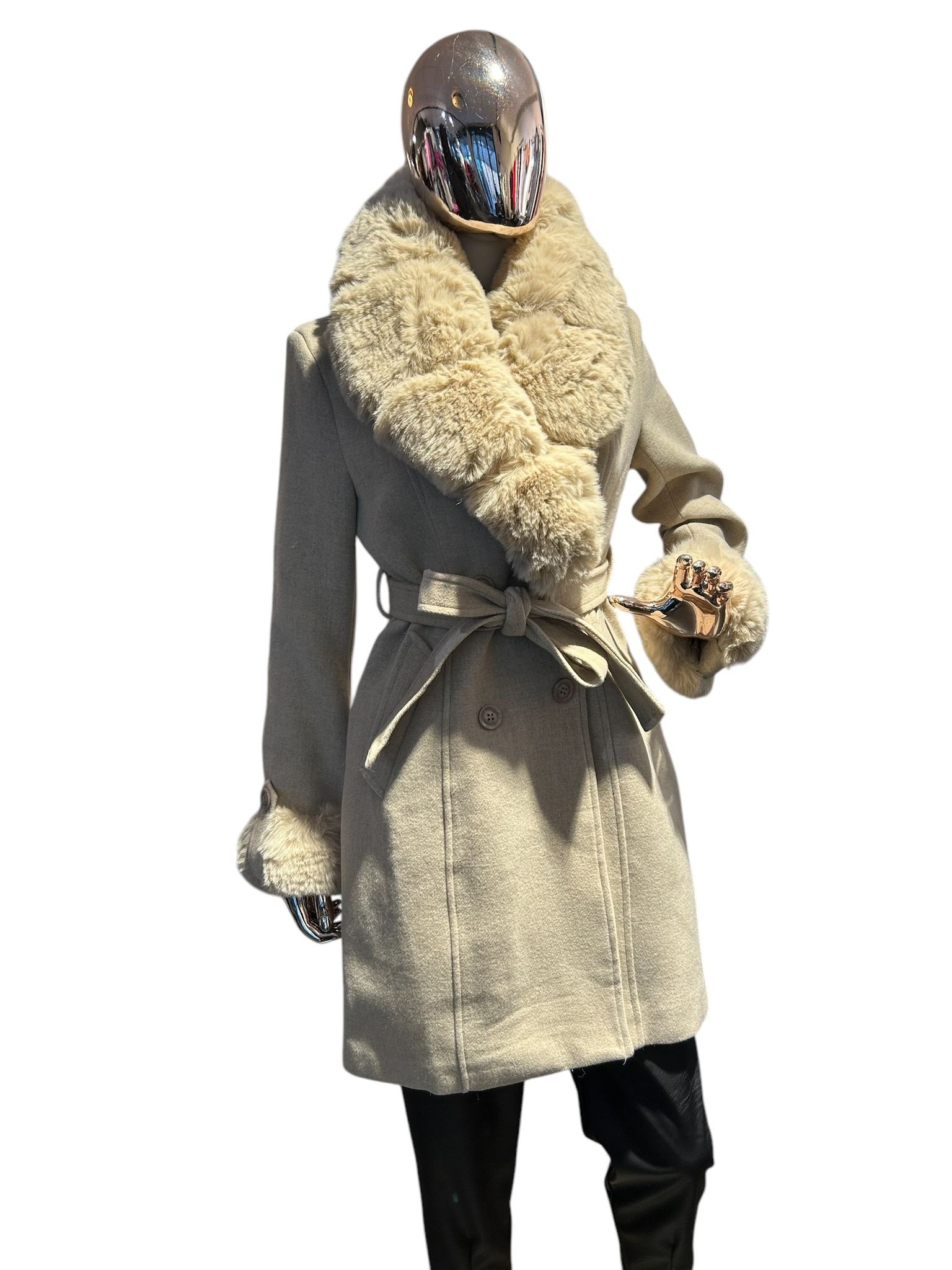Belted Vegan Wool Coat With Removable Fur Cuffs & Fur Collar -Beige WB440F3